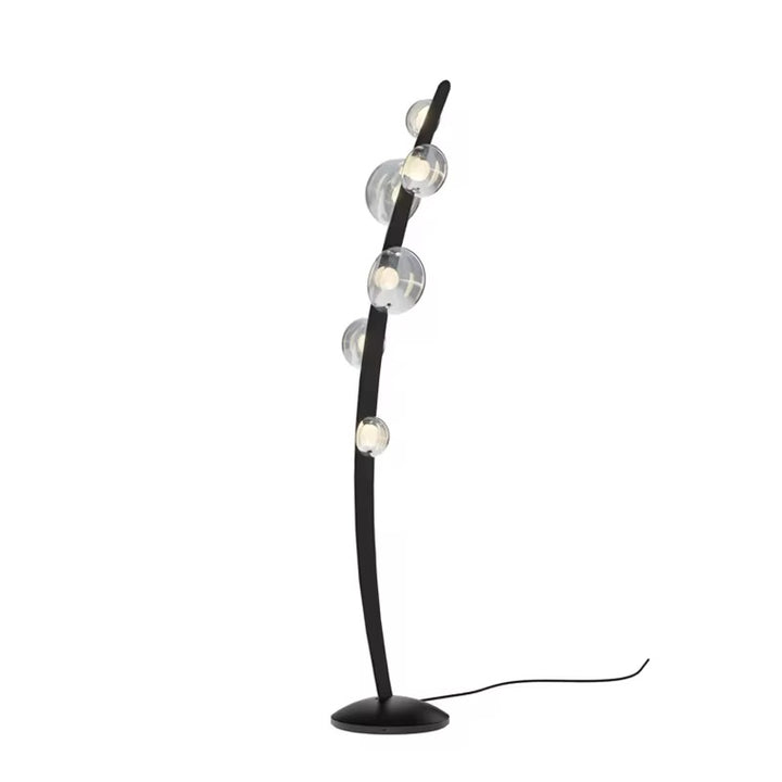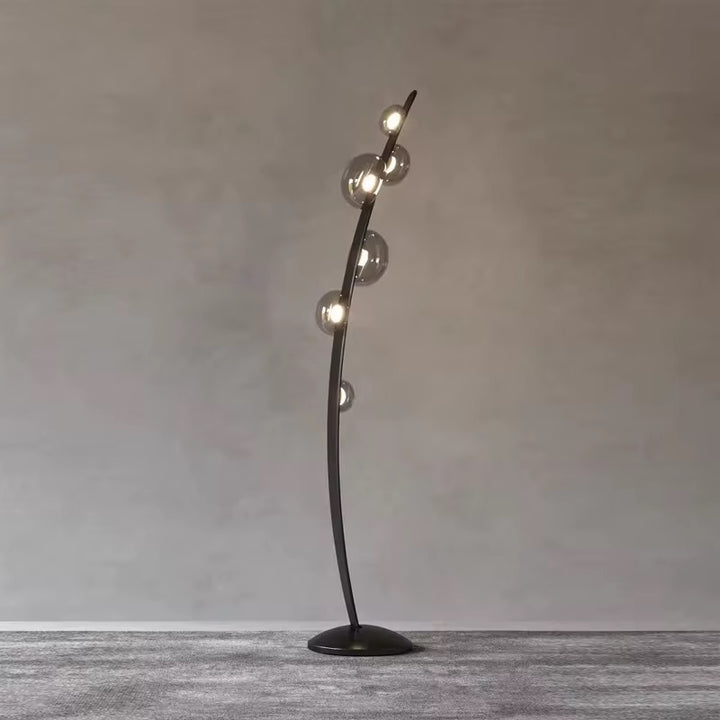 The lighting in this image is modern and artistic, featuring a floor lamp with a curved stand and multiple spherical glass bulbs arranged along its arc. The warm, soft light creates a cozy and elegant ambiance, perfectly complementing the minimalist and sophisticated interior design.