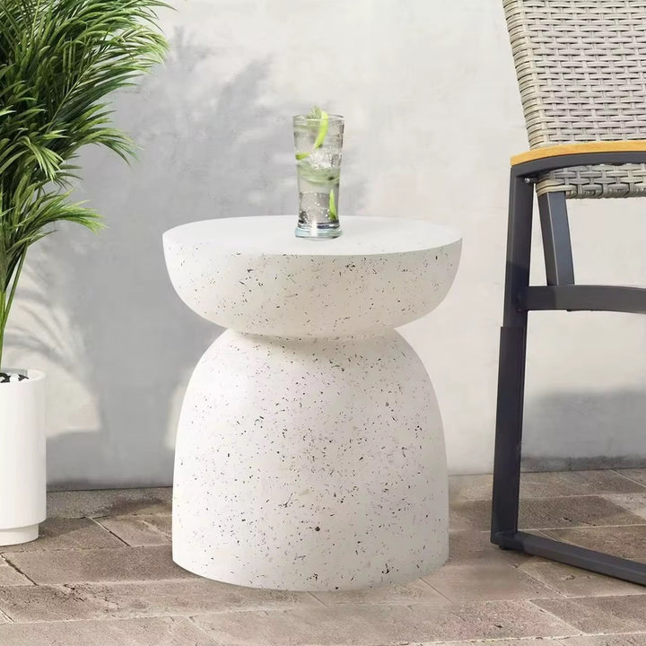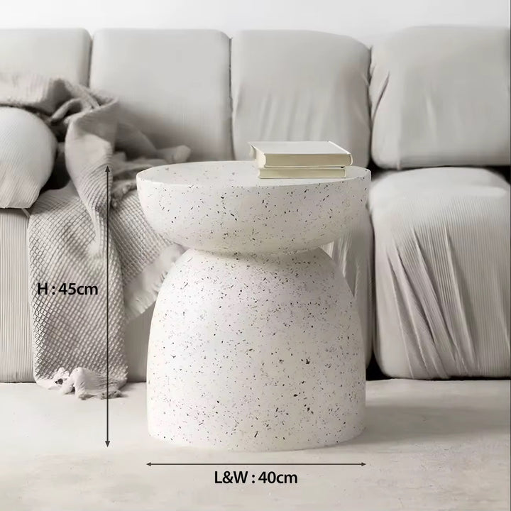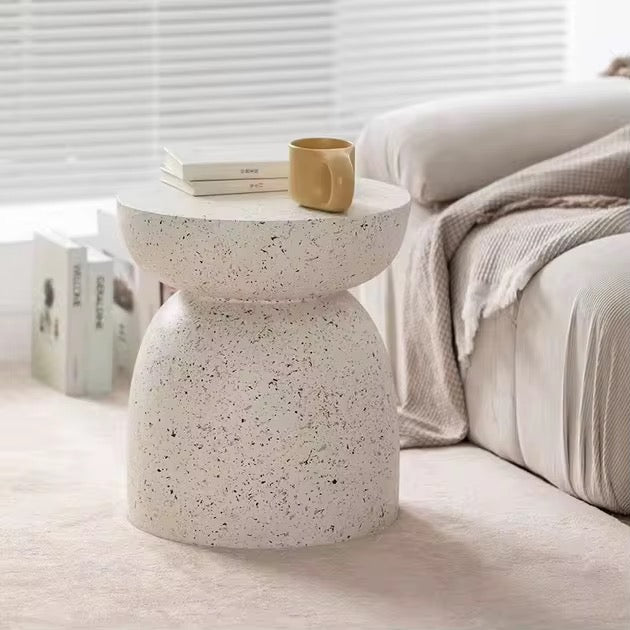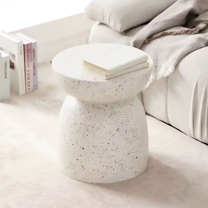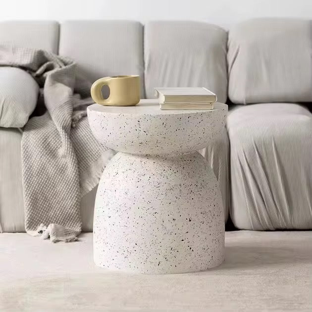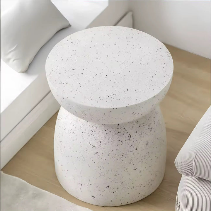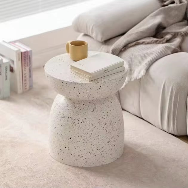 This is a modern minimalist side table featuring a smooth, rounded silhouette. It is crafted with a terrazzo-style finish, showcasing a white base with subtle speckled details for a natural, contemporary look. The sturdy cylindrical shape provides excellent stability, making it ideal for use as a bedside table, coffee corner piece, or decorative accent in any living space. Its clean design blends seamlessly with modern, Scandinavian, and neutral interior styles